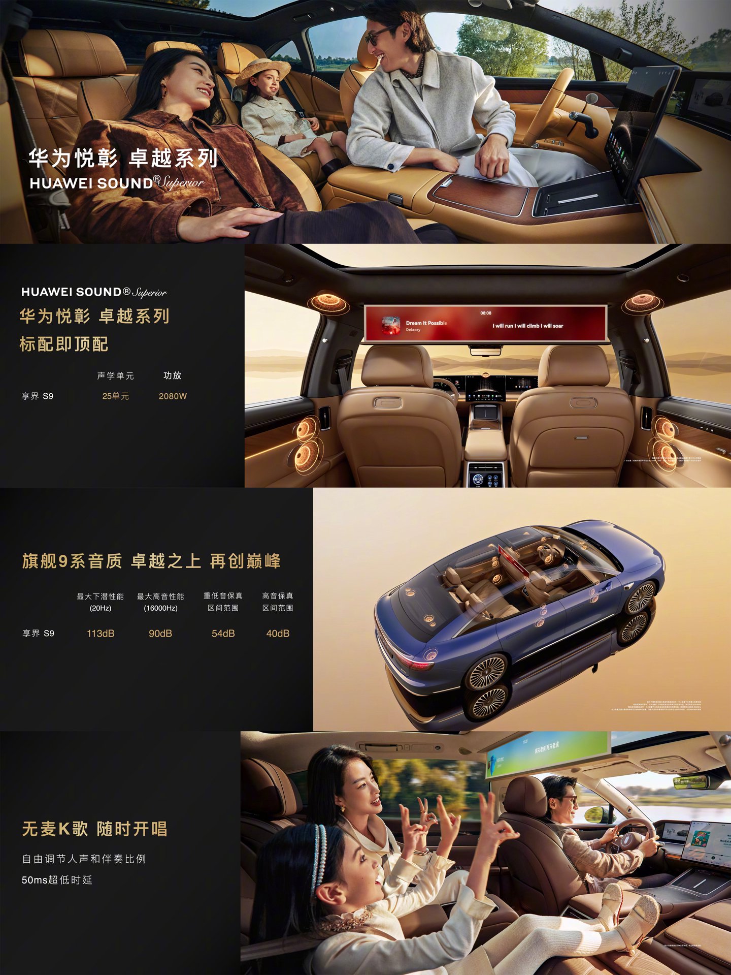 新车标配华为悦彰音响超卓系列,具备 25 声学单位,功放 2080W,堪称具备“超卓之上”的音质,补助无麦 K 歌;标配 12.3 英寸副驾屏,配备智能投影巨幕系统 2.0,具备德国莱茵硬件低蓝光等认证。