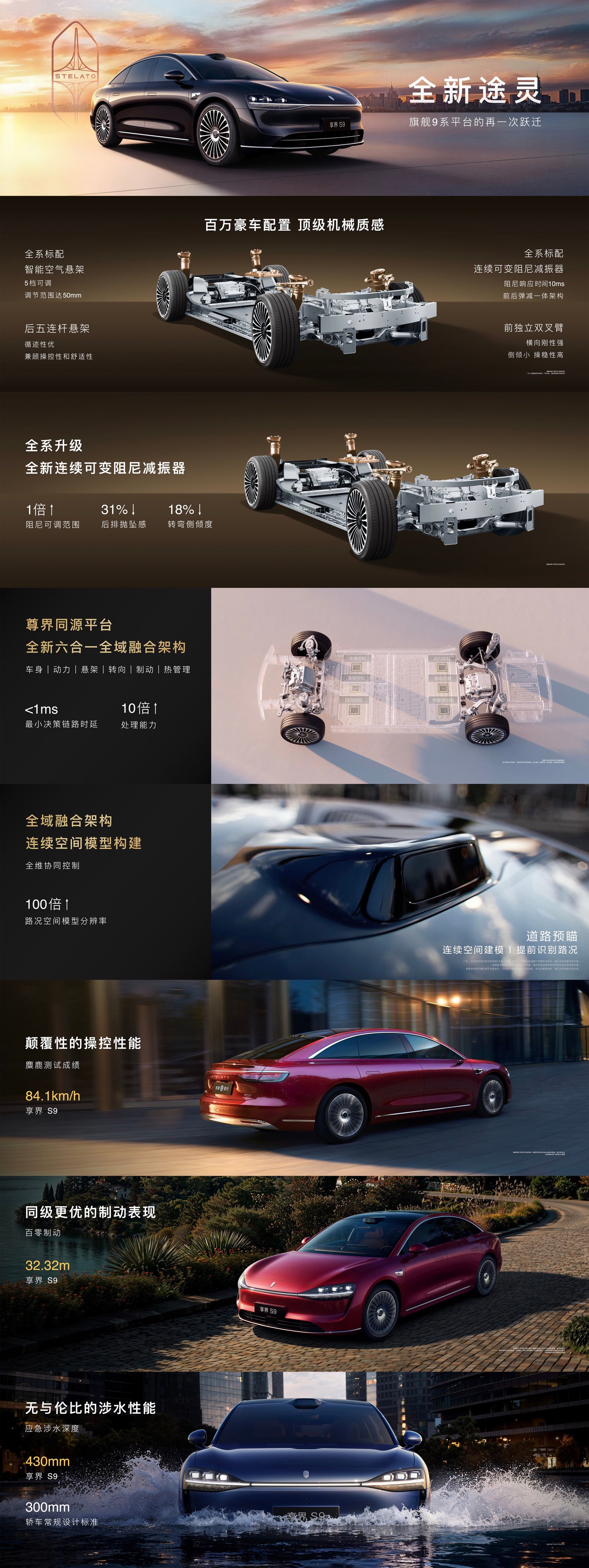 新款享界 S9 搭载全新华为途灵平台,全系标配智能空气悬架和全新一语气可变阻尼减振器,升级尊界同源全新宇宙一全域和会架构,补助一语气空间模子构建,收尾全维协同适度。该车还领有 430mm 的涉水性能,100km/h 到 0 制动距离 32.32m,麋鹿测试收获为 84.1km/h。
